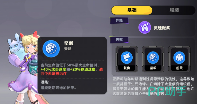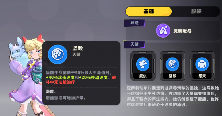 “坚毅”作为备选天赋,侧重短时爆发:当亚萨莉生命值低于50%时,自动提升40%攻击速度与20%移动速度。该效果虽能强化机动与输出节奏,但存在显著限制——触发期间无法接受任何治疗。因此需谨慎规划使用时机,建议在潜能激活并提供额外护甲加成后启用,避免因血量失控导致提前退场。