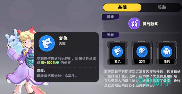 “复仇”天赋则构建反制逻辑:每当亚萨莉受到任何形式的治疗,即对随机一名敌人造成等同于其最大生命值100%的属性伤害;潜能解锁后,还可附加生命再生效果。该机制既可作为被动增伤补充,亦能在特定阵容中形成治疗链反打闭环,战术适配面广。