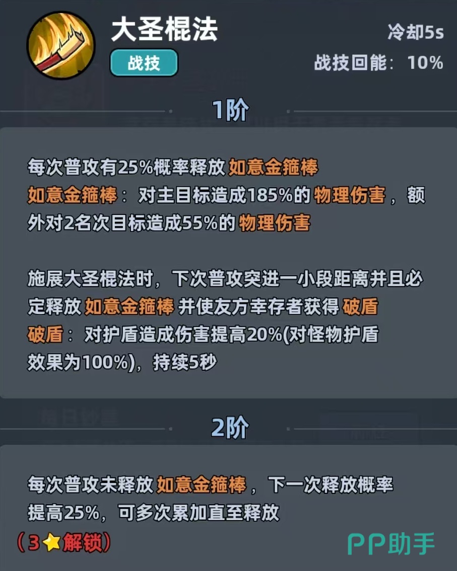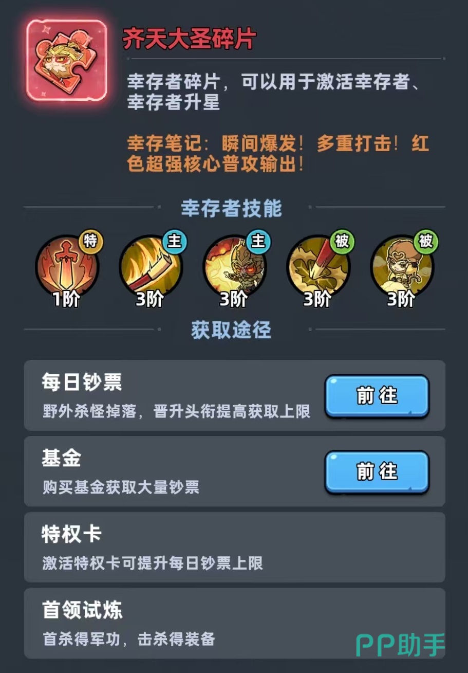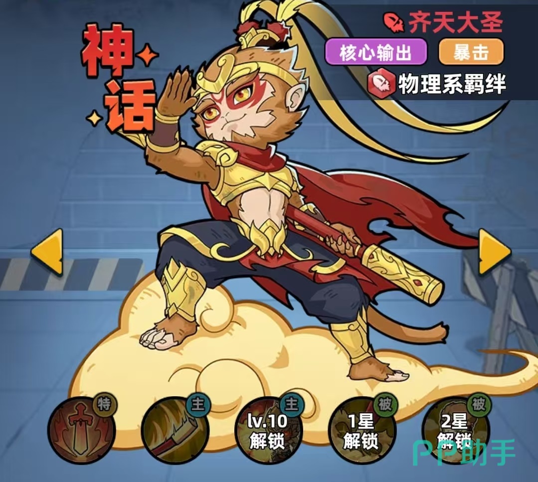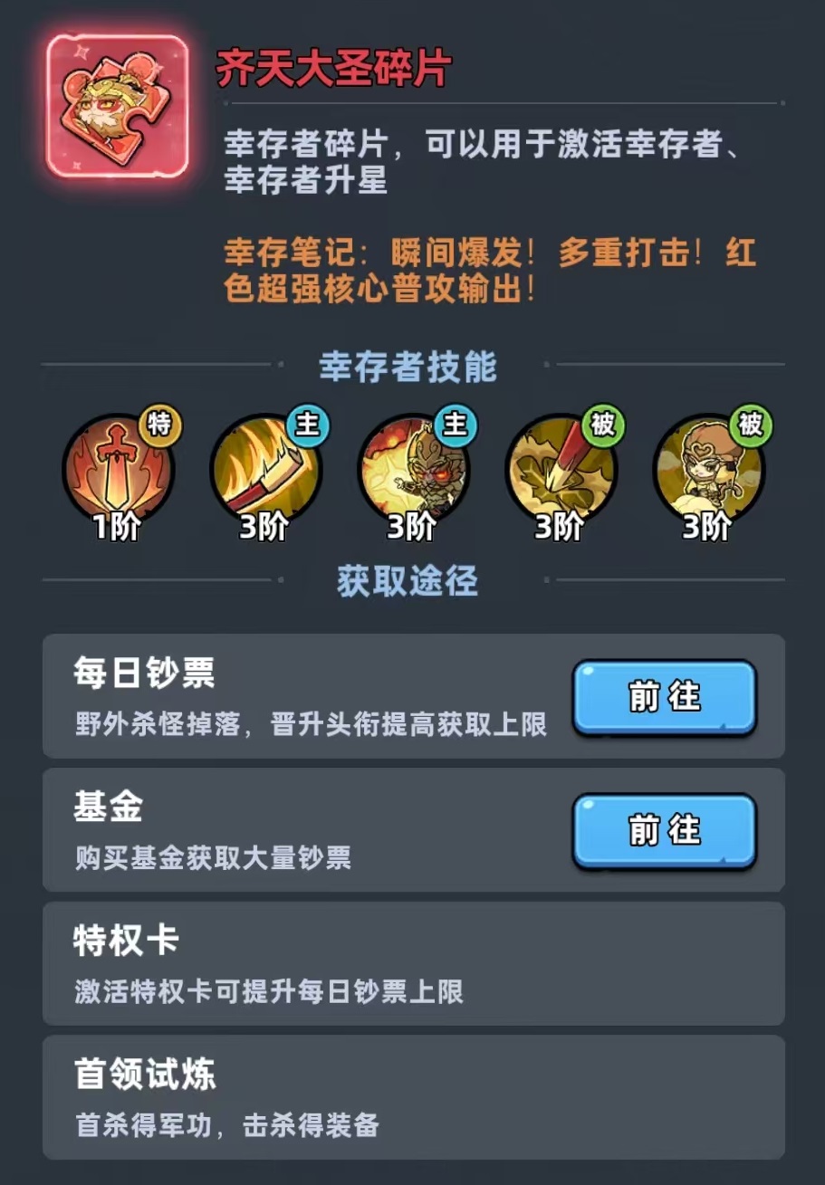 齐天大圣归属物理系羁绊,定位为队伍核心输出位,核心优势集中于暴击率与暴击伤害的双重叠加机制。碎片获取渠道丰富,涵盖每日钞票结算、基金返还、特权卡奖励等常规途径,无稀有活动门槛,平民玩家亦可稳定积累。其主动技能“大圣棍法”在普通攻击中触发概率性释放“如意金箍棒”,对主目标造成高额物理伤害,并额外溅射至两个相邻单位;每次成功施展后,下一次普攻将附带短距离突进效果,且必定触发金箍棒,并为全体友方幸存者赋予“破盾”状态,显著提升团队对护盾型敌人的压制效率。
