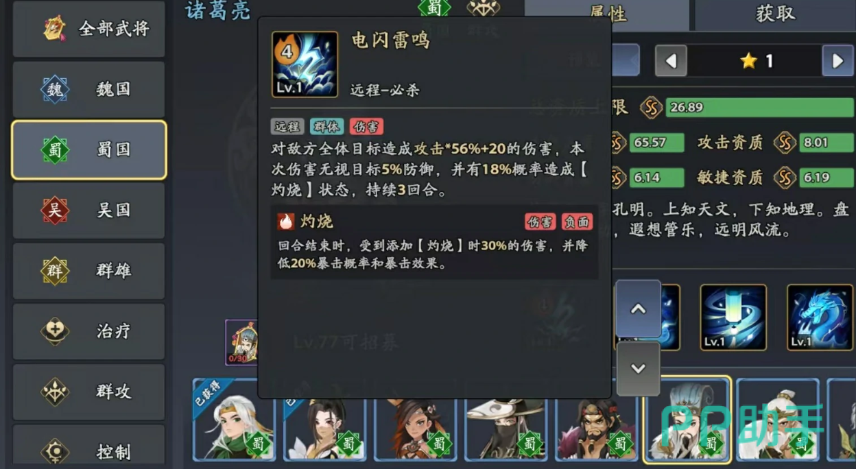 诸葛亮作为蜀国阵营的重要成员,具备出色的群攻输出能力,能够在多目标战斗中造成显著伤害。他的首个技能名为电闪雷鸣,是一项远程范围攻击技,可对敌方全体单位施加伤害,并无视目标一定数值的防御属性。该技能还附带灼烧效果,触发后使敌人在接下来的三个回合内持续受到伤害,期间其暴击率和暴击伤害均下降20%,极大削弱对手输出节奏。