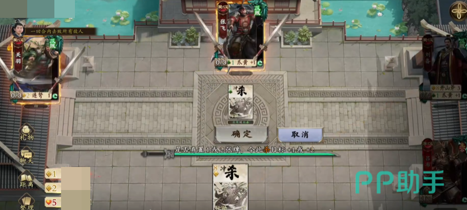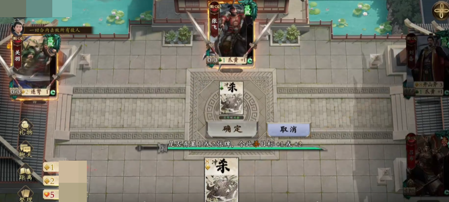 第九关名为“小畜”,需对关羽连续施放两次“顺手牵羊”,随后对该技能作用于刘备,方可获得方天画戟。获取武器后,对刘备使用杀招并弃置两张手牌,触发方天画戟特效,将其效果同时传导至关羽与张飞二人身上,完成关卡任务目标。