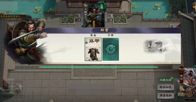第七关卦象为“师”,关键在于利用“顺手牵羊”从山贼手中夺取丈八蛇矛。此关难度较低,先用普通杀攻击山贼,触发“百步穿杨”技能后,配合强命类效果直接终结目标,便可赢得胜利。