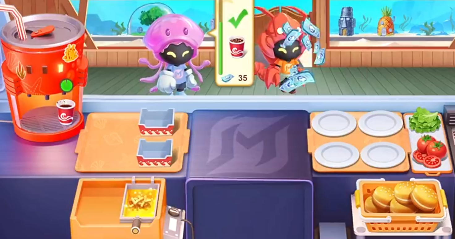 全新玩法“海底餐厅”现已开启。玩家需通过完成日常任务获取“游玩卷”,消耗后即可进入订单制作流程。操作逻辑清晰直观:先将汉堡肉煎至理想熟度,再依次叠加西红柿、生菜与汉堡胚,最终组合成经典蟹黄堡。整个过程节奏明快,兼顾趣味性与操作反馈。