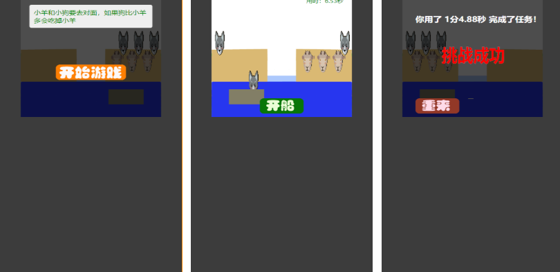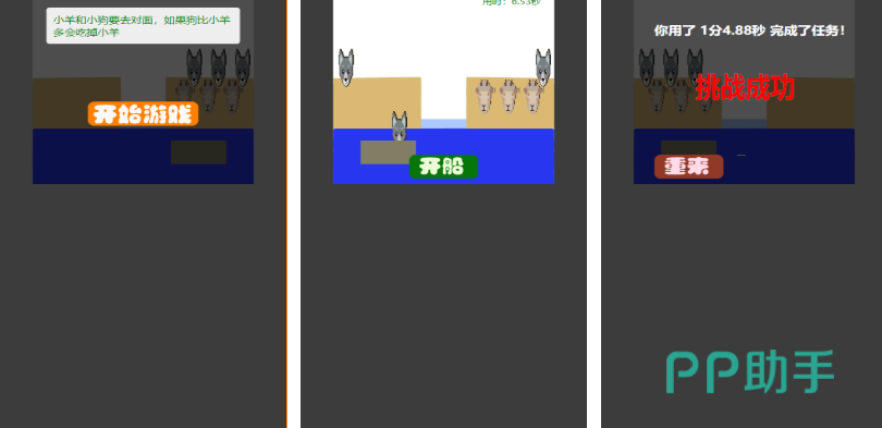 这款加入了狗狗和小羊羔元素的游戏玩法特立独行,你将互送小狗狗和羊羔抵达对岸,但每一次运输动物的数量都是有限的,你必须在限定的步数之内将小羊和小狗送到对岸,别具一格的玩法和简约的美术令人印象深刻,具备烧脑解谜元素的运输机制也是亮点,小狗狗和羊羔的头像看上去也很呆萌生动。