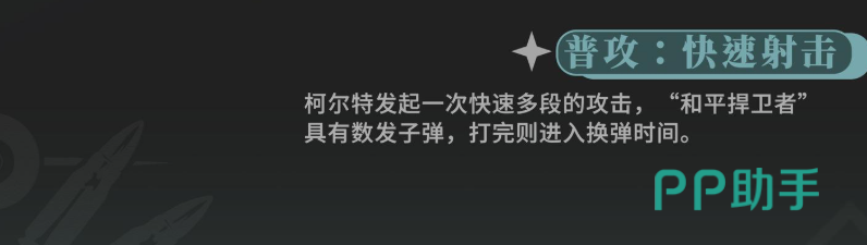柯尔特是一位SR品质角色,拥有“荒野执法官”的称号。他的战斗机制高度依赖射击类技能,在普通攻击方面具备快速射击能力,能够连续发射多发子弹造成多次伤害。其使用的武器名为和平捍卫者,在普攻过程中会消耗弹药,当弹匣打空后需要进入换弹阶段,期间无法执行其他操作,因此合理规划输出节奏至关重要。