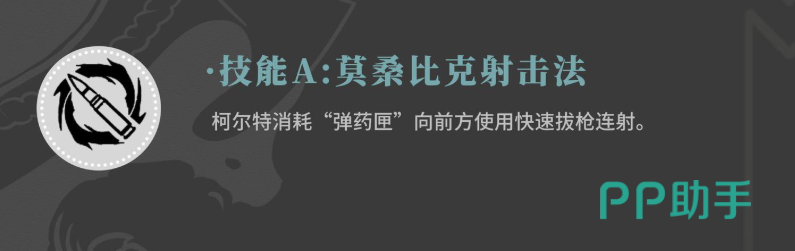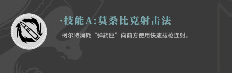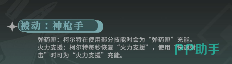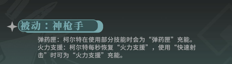 他的被动技能名为神枪手,属于自动触发效果。该技能与弹药匣状态密切相关——每当其他角色释放技能时,柯尔特的弹药匣将获得充能。随着火力支援值的积累,该被动可在后续战斗中实现每秒自动恢复部分火力支援数值。此外,使用快速射击也能进一步为火力支援充能,使其成为维持持续作战能力的关键机制。