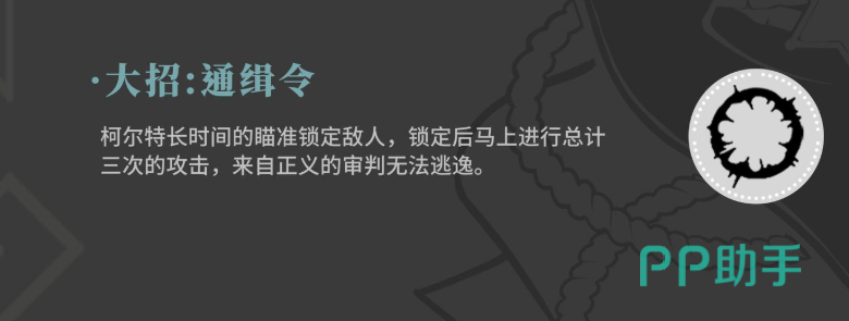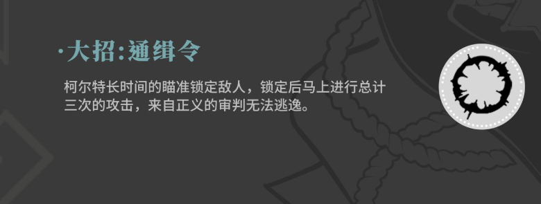 第三个技能是中轴重锁系统,施放时将消耗当前的火力支援数值,锁定附近一名敌方单位并精准瞄准其弱点发起快速射击。每次攻击命中均可回复部分弹药匣容量,增强续航能力。若在近距离蓄力瞄准敌人弱点后再释放该技能,则不会消耗火力支援资源,同时仍可获得弹药回填效果,提升了战术灵活性。大招技能名为通缉令,拥有较长的冷却时间,释放时柯尔特将长时间锁定单一目标并进行三次连续打击,即使对手具备闪避技能也难以规避此次攻击的全部伤害,具有极强的单体压制力。