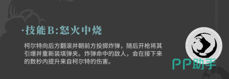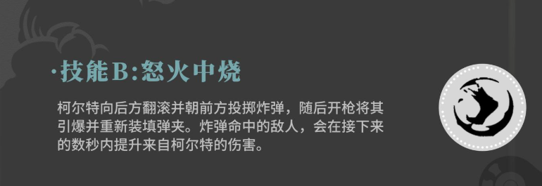 技能一为莫桑比克射击法,该技能需提前储备足够的火力支援值。激活后,柯尔特将向前方目标进行高速连射,攻击频率极高,适合在高充能状态下打出爆发输出。技能二名为怒火中烧,施放时柯尔特会先向后翻滚,随后投掷一枚炸弹至前方区域。此炸弹不会立即爆炸,而是需玩家手动开枪引爆,成功命中敌人后不仅能造成范围伤害,还能为自身补充弹匣容量,并在一段时间内提升柯尔特的基础伤害,适合作为连招起手技使用。