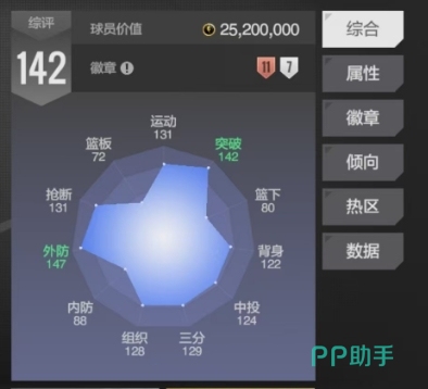 巴特勒的徽章情况是拥有11枚铜徽章和7枚银徽章,这些徽章覆盖的范围极为广泛,其中有专门提升冲击篮下能力的徽章,进一步增强了他在内线的得分效率,在防守方面,他也拥有多个银徽章,这些徽章能够让他更好地完成防守任务,有效地限制对手的进攻。
