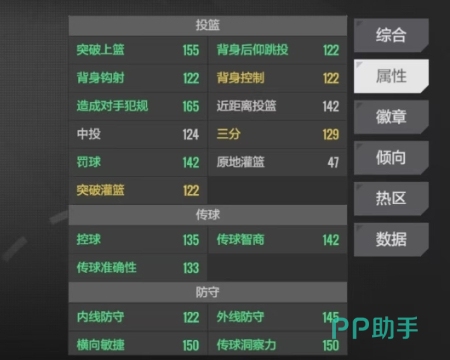 在属性达到20级6突的时候,他的各项数据更是亮眼,其中突破上蓝的能力值达到了155,这意味着他在突破到篮下时的上篮成功率相当可观,背身后仰跳投的能力值为122,这显示了他在进行背身单打时的后仰跳投技巧,很难被对手封盖,中投能力值达到了124,说明他在中距离区域的投篮命中率较高,是一个可靠的中距离射手,三分球能力值也有129,这表明他在外线也具备一定的三分远投能力,能够为球队拉开空间。
