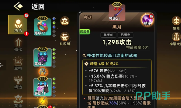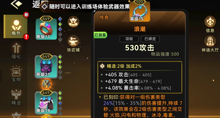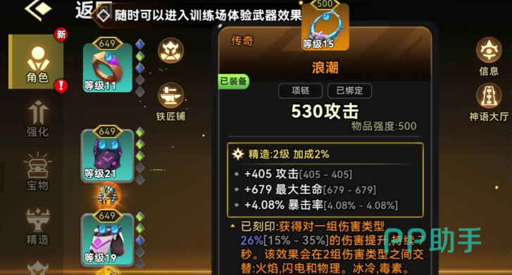 防具推荐庇护战袍,提供198点防御和2525点生命值,每五秒回复27点生命,投弹技能释放后三秒内还可获得15.5%减伤效果,显著提升容错率。项链部位首选浪潮,拥有405点固定攻击力、679点最大生命以及4.08%暴击率,其刻印效果在切换状态后能提升两种伤害类型各26%,对整体输出有明显加成。武器方面,黑月单手剑是理想之选,基础攻击高达1298,并额外附加15.84%的暗光伤害,完美契合套装体系。
