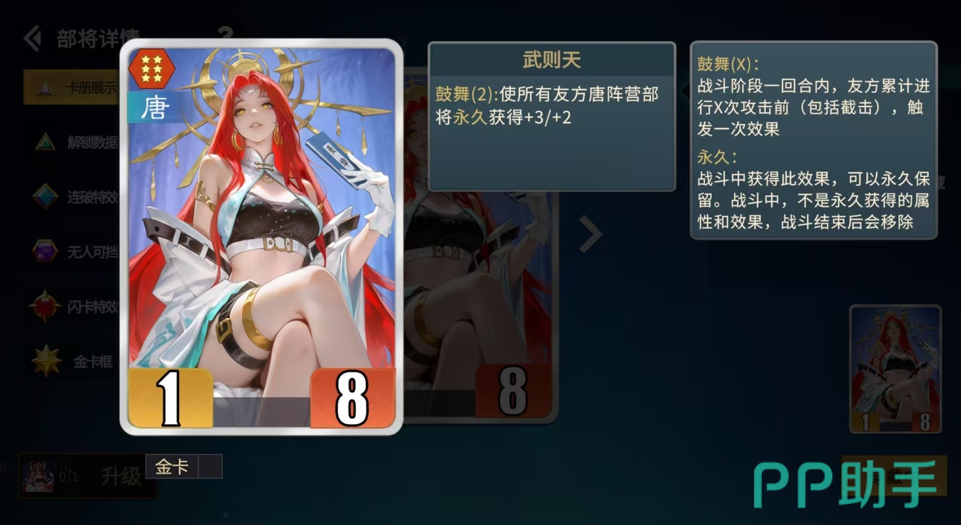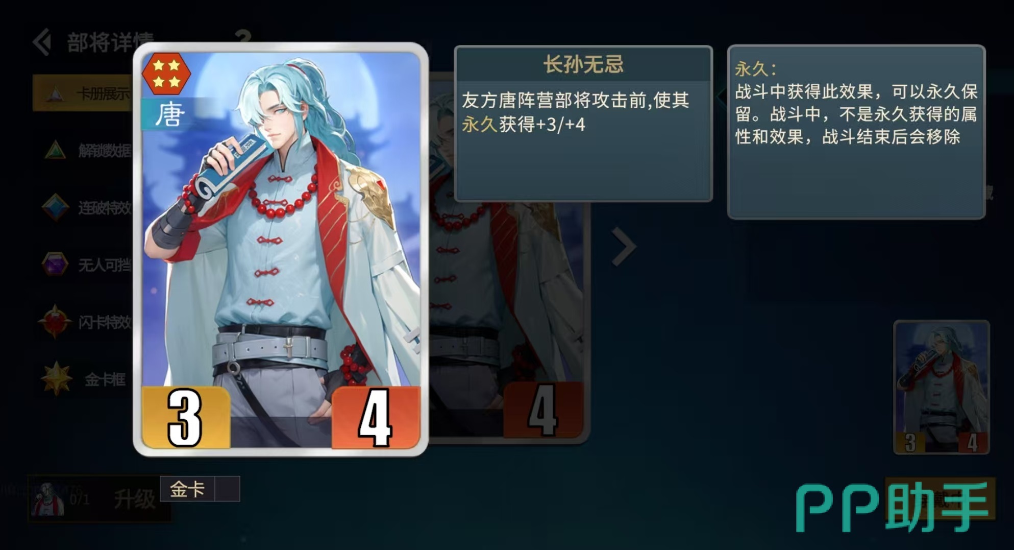 长孙无忌是截击流中不可或缺的增幅引擎。其技能效果为:每当友方唐阵营部将发动攻击前,该单位即获得+3/+4属性提升(金卡为+6/+8)。该效果专精于单体爆发强化,在秦琼高频截击场景下收益远超武则天的群体鼓舞。虽然武则天提供的全队属性加成具有战略价值,但其增益分散、单点提升有限,无法匹配截击流对核心输出单元的极致堆叠需求。二者协同使用,方能兼顾主C成长与整体战力厚度。