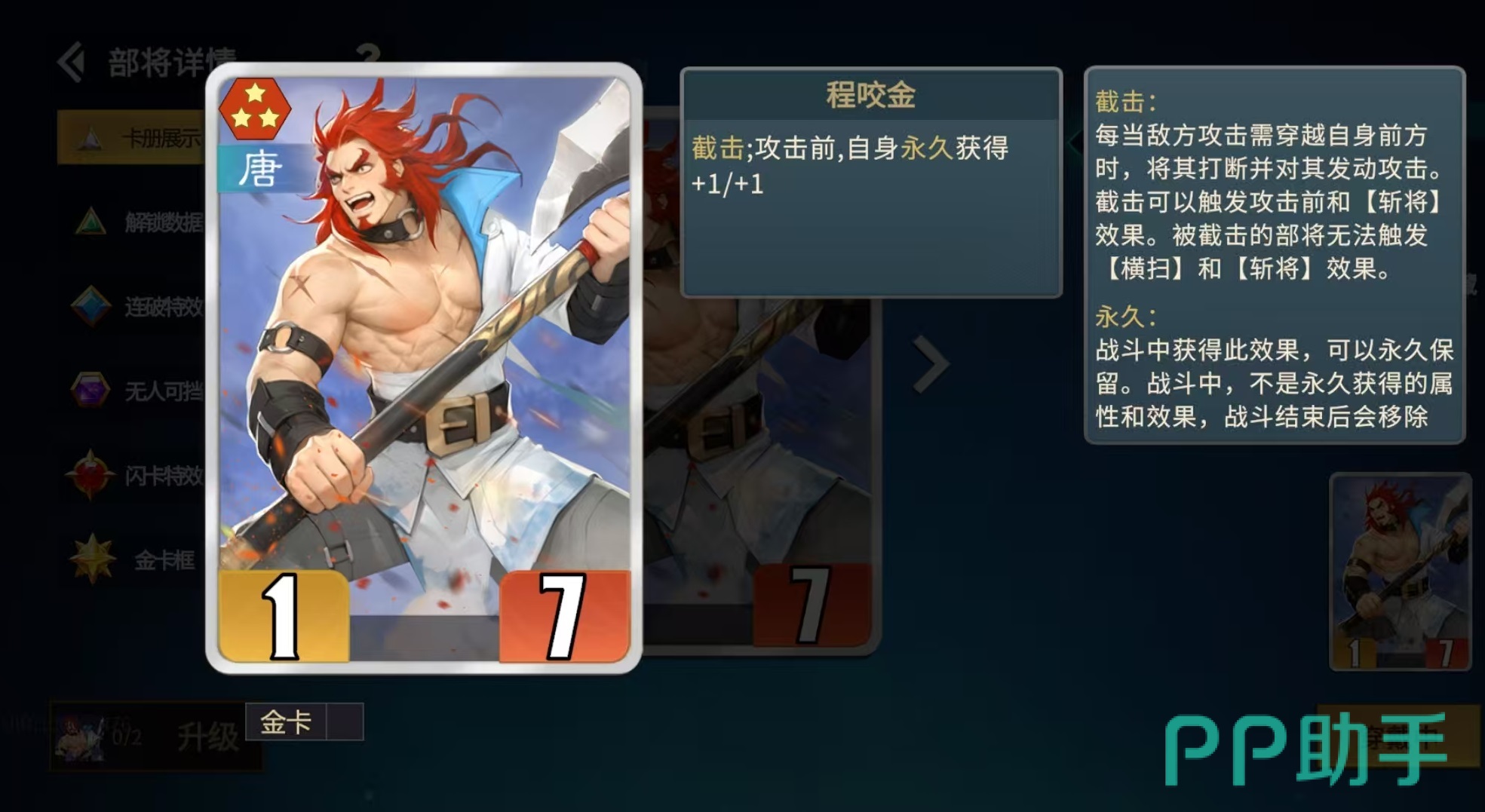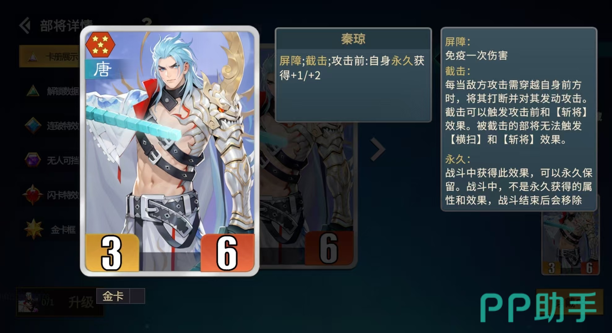 秦琼是此流派无可替代的核心主将。其基础机制包含双重关键特性:屏障与截击。屏障使其可免疫首次受到的伤害;而截击则在敌方单位向后方目标移动时强制触发,发动一次完整攻击,并同步激活“攻击前”类效果(如属性加成)及“斩将”效果。值得注意的是,被截击的目标将无法执行横扫与斩将动作。秦琼每次成功截击后所获得的攻击力与生命值加成均为永久生效,且不随回合结束重置。若为金卡品质,初始加成由+1/+2提升至+2/+4,成长曲线极为陡峭。