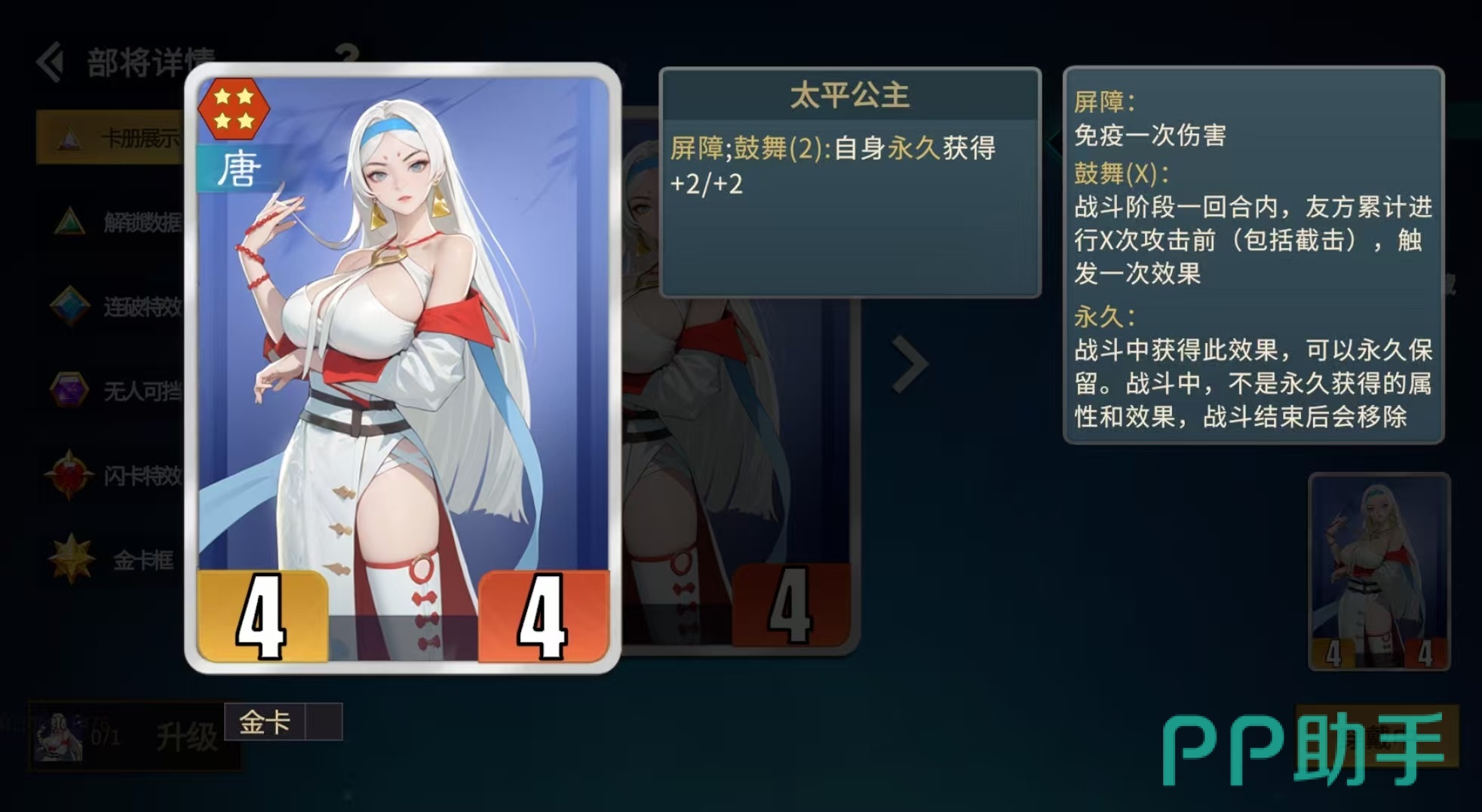 由于截击仅在敌方单位“穿越前方”路径时触发,阵容布阵需确保机制稳定生效。最优解为将秦琼置于右数第二格,最右侧配置一张具备“护卫”特性的卡牌。敌方AI默认优先攻击带护卫单位,因此秦琼可每回合稳定拦截至少一次攻击,实现属性持续滚雪球式叠加。唐阵营内唯一原生携带护卫的武将是李秀宁,但其基础数值偏低,难以承载长期成长需求。更优方案是选用太平公主作为护卫位核心,再为其装配中立卡牌“夜巡”或“日巡”,通过技能赋予护卫状态,兼顾生存与功能性。
