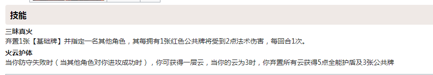 三昧真火就是一个强力的输出技能,可以指定一名角色发动攻击,可以巧妙地利用敌方红色公共牌。如果对方只有一张红色公共牌,那么就会受到两点法术伤害。在一次性释放技能之后就可以造成巨额伤害,但需要注意在每一个回合只可以使用一次。