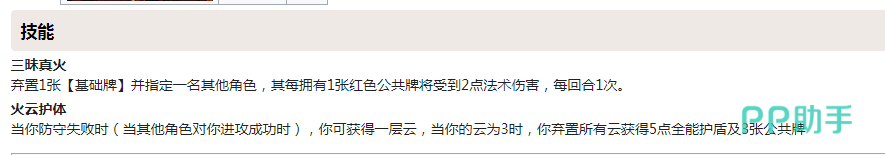 火云护体属于一个防御技能,一旦在防守失败时,那么此时红孩儿就会获得一层云。如果累计到三层就可以得到5点全能护盾,而且还可以获得三张公共牌。能迅速的提升生存能力,并且还可以补充手牌的资源。