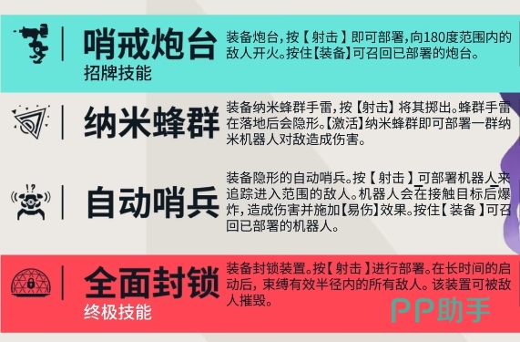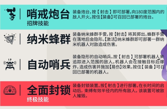 而纳米蜂群则是可以带来引爆效果,在实战中纳米蜂群通常会被放置在哨兵技能的前方一点的位置,这是因为哨兵技能能够提前察觉到敌人的到来,当哨兵技能触发时,意味着敌人已经出现在视野范围内,此时配合上被哨兵技能击中而带有易伤效果的敌人,纳米蜂群的爆炸伤害很容易对敌人造成重伤甚至直接将其阵亡。