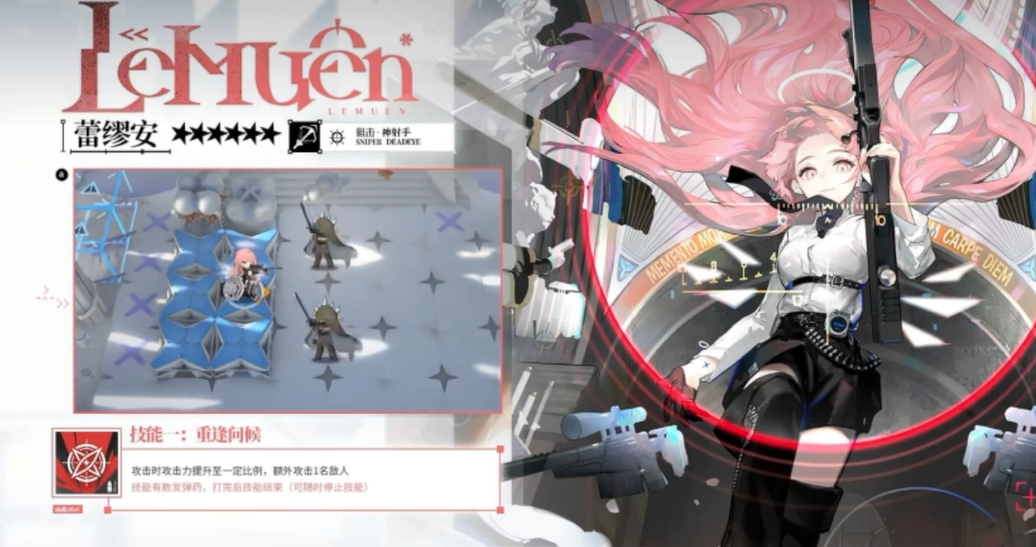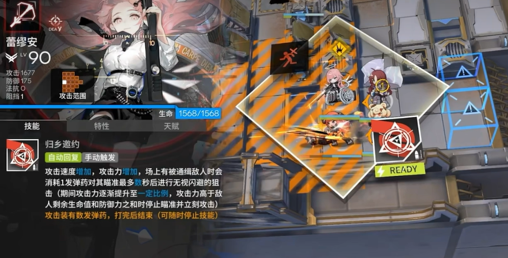 至于她的技能,蕾缪安展现出了她的多面性和战略性。第一技能“重逢问候”让她在攻击时增强自身的攻击力,并额外攻击一名敌人。这个技能不仅能提升她的输出,还能在关键时刻攻击到更多敌人,快速清理战场。而二技能“归乡邀约”则是她最具特色的技能之一。开启后,她的攻击速度和攻击力都能得到显著提升。更重要的是,如果场上有被通缉的敌人,她还会消耗弹药进行精准狙击,这一狙击可以无视敌人的闪避能力,并且攻击力会随着时间逐渐增强。想象一下,当敌人残血时,她的这一击可以直接决定战斗的胜负。