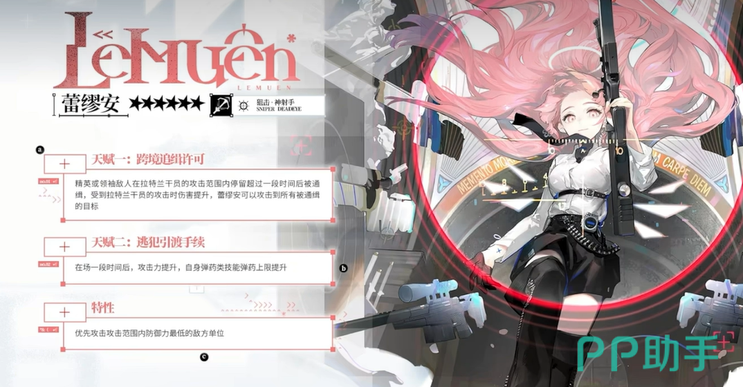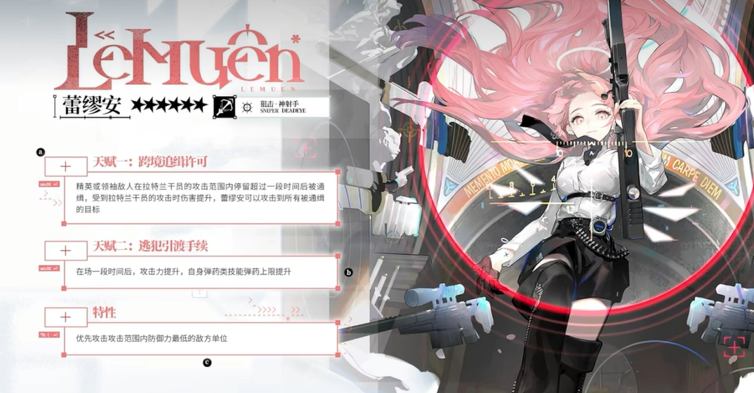 她的第一天赋“跨境追缉许可”是她的亮点之一。每当精英或领袖敌人进入她的攻击范围,并且在一定时间内停留,她就会将这些敌人标记为通缉目标。通缉目标的特点是什么?简单来说,就是它们会承受更高的伤害,并且蕾缪安可以随时攻击这些目标。这个设定让她的战斗节奏更加流畅,能够持续保持高压输出。而第二天赋“逃犯引渡手续”则提供了额外的增益。随着战斗的推进,蕾缪安的攻击力会逐渐提高,而且她的弹药上限也会得到增强,这让她的持续输出更加持久,面对长时间的战斗也不易感到疲软。
