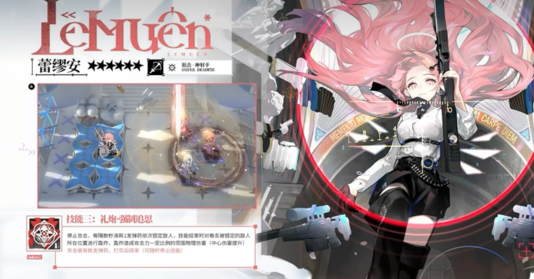 至于她的三技能“礼炮·强制追思”,这是一项超级华丽的技能。蕾缪安在停止攻击后,会锁定多个敌人,每隔一段时间消耗一发弹药,依次轰炸被锁定敌人的位置。每次轰炸都会造成相当可观的物理伤害,且中心的伤害更为强烈。如果战场上的敌人集结成群,蕾缪安的这一技能可以说是非常致命,足以瞬间改变局势,重创敌军。