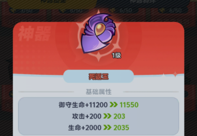 以当前版本高人气神器“死返玉”为例:装备后,格斗家的生命值、攻击力及御守生命三项基础属性均获得可观提升;更关键的是,每当消耗30枚白银勋章,角色即可额外获得530点生命值,该效果可叠加至最高10层,累计额外生命达5300点以上。这一机制对前排坦系角色可大幅增强承伤能力,对后排输出角色亦能显著提升生存容错率,是兼顾功能性与成长性的代表性神器。