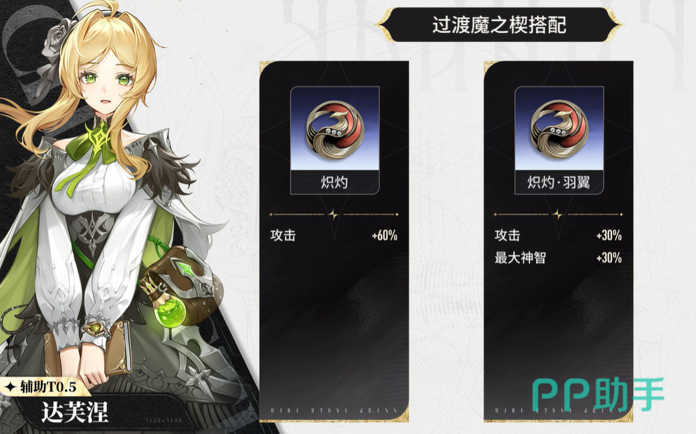 关于魔之楔的搭配,前期过渡阶段建议使用炽热套装。该套装提供额外攻击力加成,而攻击力的提升有助于扩大被动所附加的暴击率上限,从而增强辅助效能。考虑到达芙涅并非主输出角色,仅需凑齐两件套即可获得核心收益,其余属性对她的功能性帮助有限,避免资源过度投入。