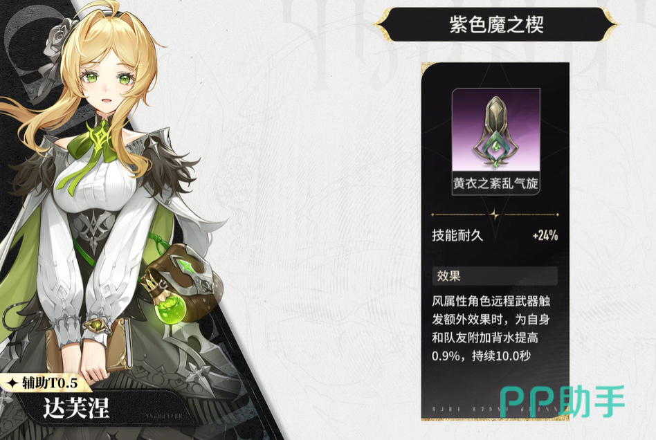 进入游戏中后期后,可将装备更换为黄衣魔之楔。此套装不仅能延长技能持续时间,使达芙涅有更充裕的时间完成被动叠加,还能直接提高全队的基础暴击率。这一增益大幅加快了暴击层数的累积速度,同时延长了增益状态的持续时间,不易中断,完美契合达芙涅的辅助定位,进一步释放团队的输出潜力。