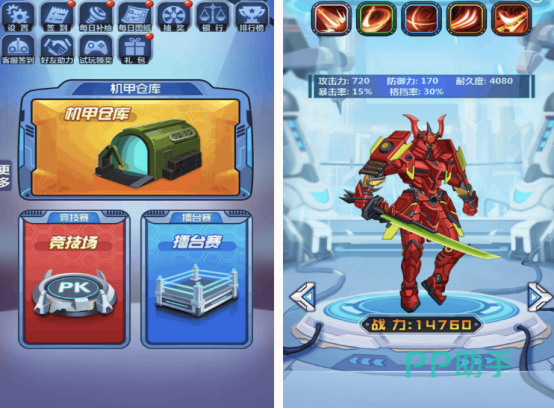 这是画面表现非常炫酷,有很多钢铁机甲战士,通过将钢铁机甲战士的攻击力,以及防御力等方面的能力,得到提升以后,可在竞技场或者是擂台赛当中获得不错的成绩。通过自己收入的技巧,在仓库里面帮助你具备更强大的战斗力。面对其他类型的机甲,战士时需要拿起手中的武器与其进行较量,要尽可能的对角色各方面进行升级。