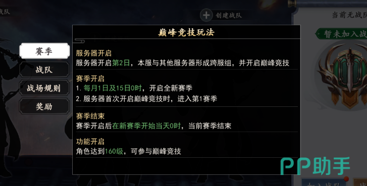 第二个就是巅峰竞技玩法,这是就需要大家去创建队伍来进行比赛了,这个比赛大家可以选择创建或者加入战斗,可以选择跨服组队!而且这个属于赛季制度的,大家可以根据选择来进行操作!不过体验这个模式也是有要求的,是需要大家等级达到160级的时候,才会开启的!