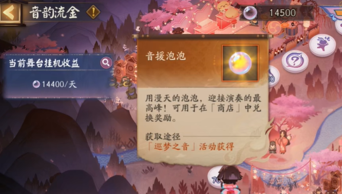 等级达到15级及以上的阴阳师就可以参加到巡梦之音活动,点击庭院左侧地藏像或者庭院右上角小纸人,就能快速切入活动界面,在这个玩法中玩家将操控神乐在舞台展开探索,探索需消耗节律开关,系统会依此投掷点数,玩家依据点数移动到相应的格子,就可以触发不同事件,每次探索事件后,玩家能收获声浪值以及音援泡泡奖励,当声浪值累计集满便可开启突破挑战,成功通过突破挑战之后舞台将迎来升级,升级之后不仅解锁更多活动奖励,还能开启更多联动曲目。