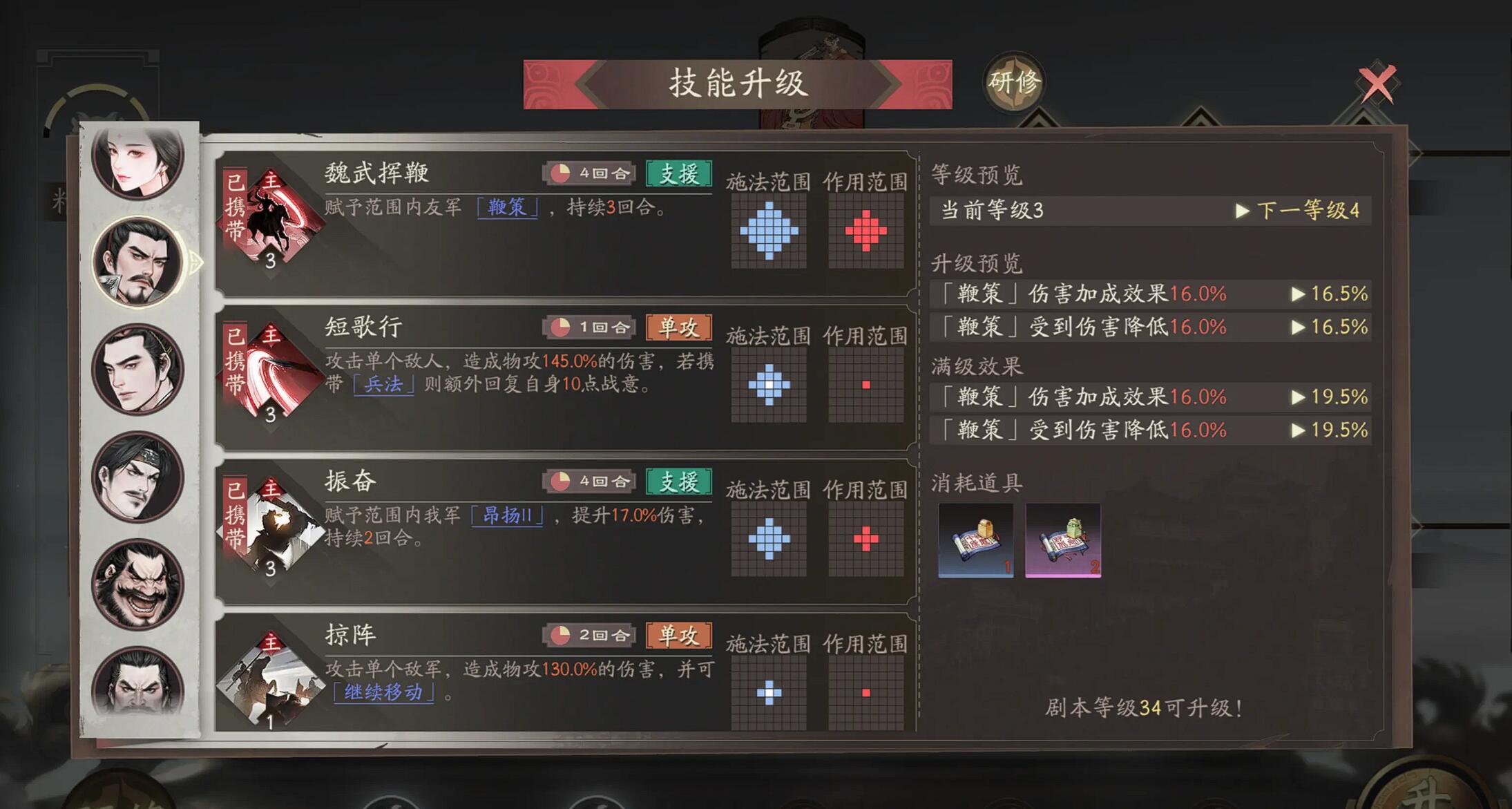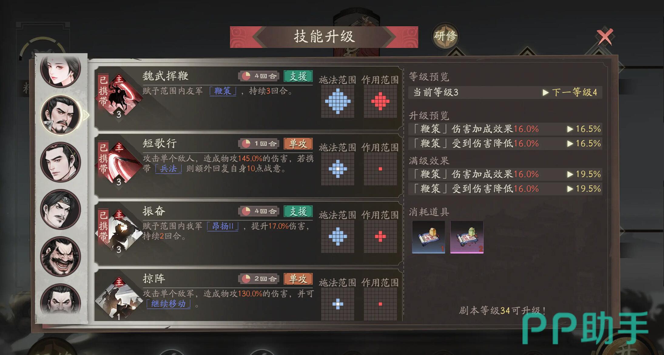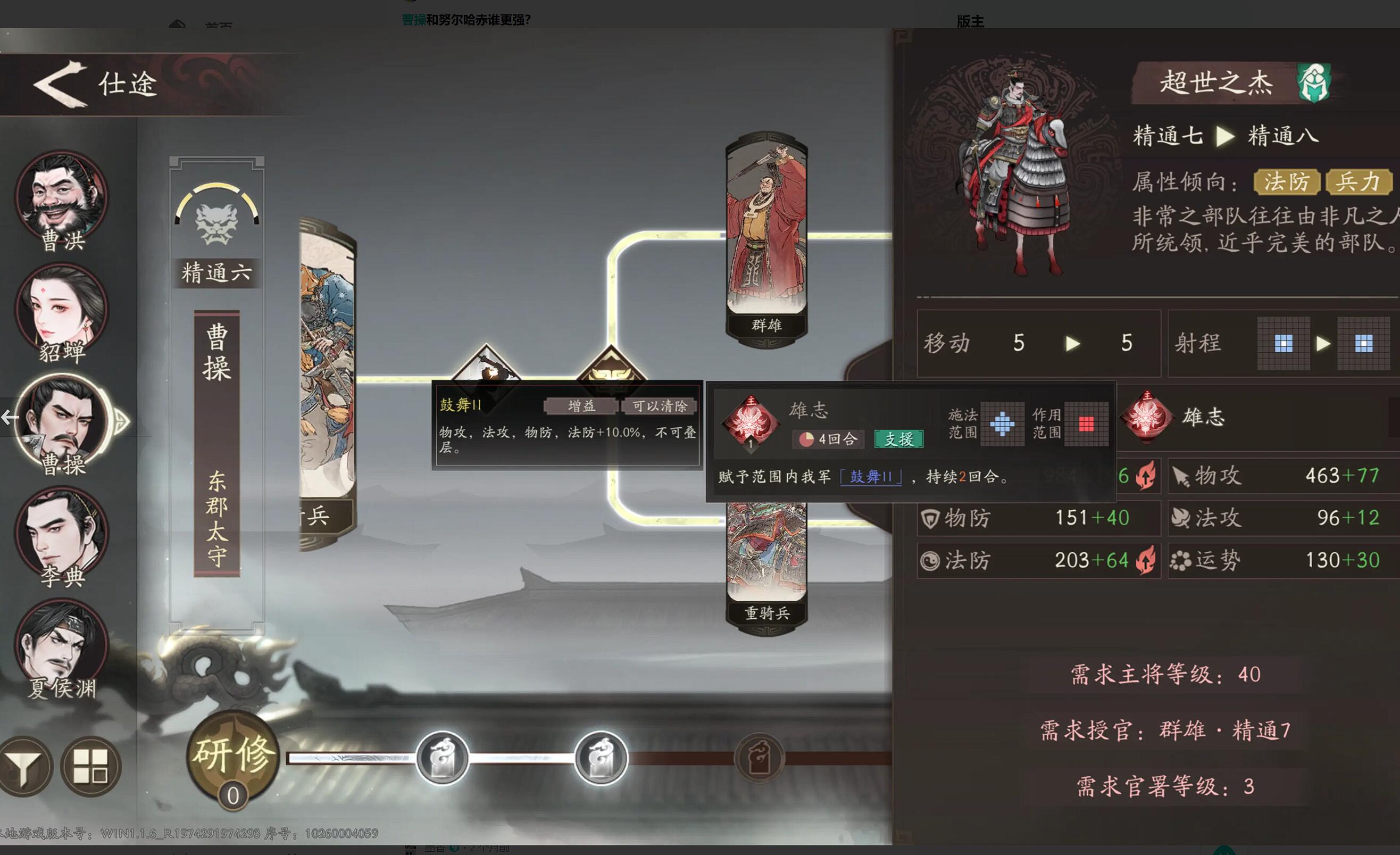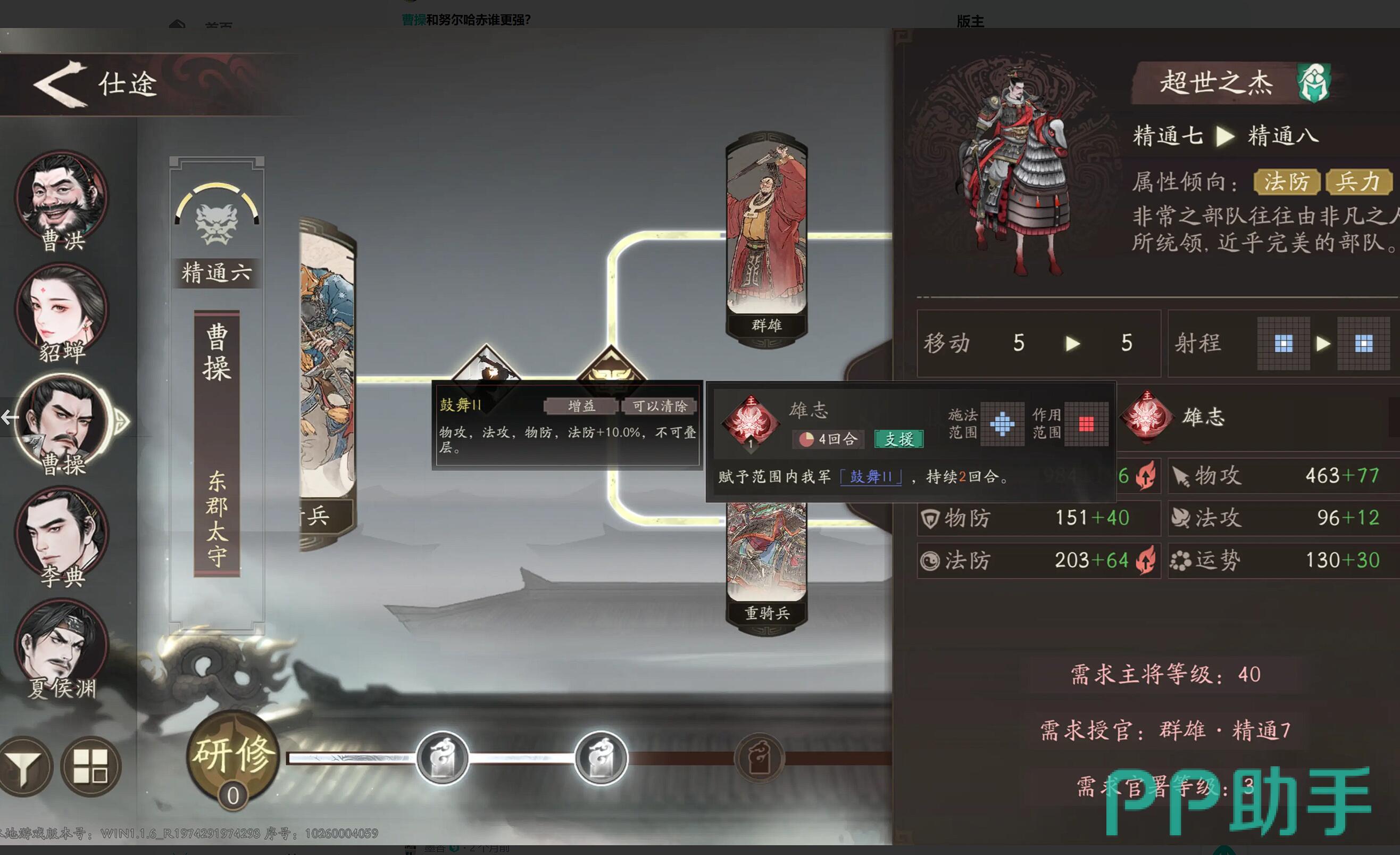 阵容确定后,技能加点策略至关重要。优先升级群雄线中的“魏武挥鞭”,该技能可造成范围伤害,并附加16%的增伤与减伤效果,是前期清怪与承伤的核心增益。随后解锁重骑兵线的“天下归心”,作为唯一的光环类技能,可在菱形两格范围内提升友军战法伤害10%。建议先将重骑兵线升至40级以激活“天下归心”,再补足群雄线的“魏武挥鞭”,最后点出“雄志(超世之杰)”来延长天赋兵法的持续时间。该技能提供全队10%的攻防加成,且可与天赋叠加生效,大幅提升团队综合战斗力。