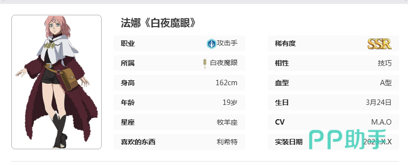 如果你对《黑色五叶草:魔法帝之道》中的白夜魔眼阵营角色感兴趣,尤其是法娜这位角色,那么她的战斗机制和技能设计一定值得深入研究。这位19岁、身高162cm的角色在实战中表现如何?接下来我们就详细解析她的技能特点与实战定位。