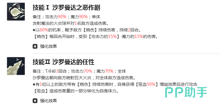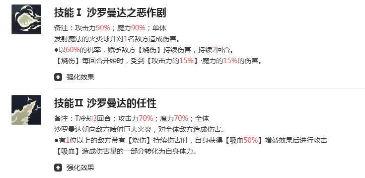 她的第一个技能“沙罗曼达之恶作剧”是一个单体攻击技,基础伤害倍率为90%,满级后可达100%。该技能有60%概率为目标附加烧伤状态,持续两回合。烧伤效果会每回合造成基于攻击力的额外伤害,叠加使用时输出非常可观,是后续连招的重要前置条件。