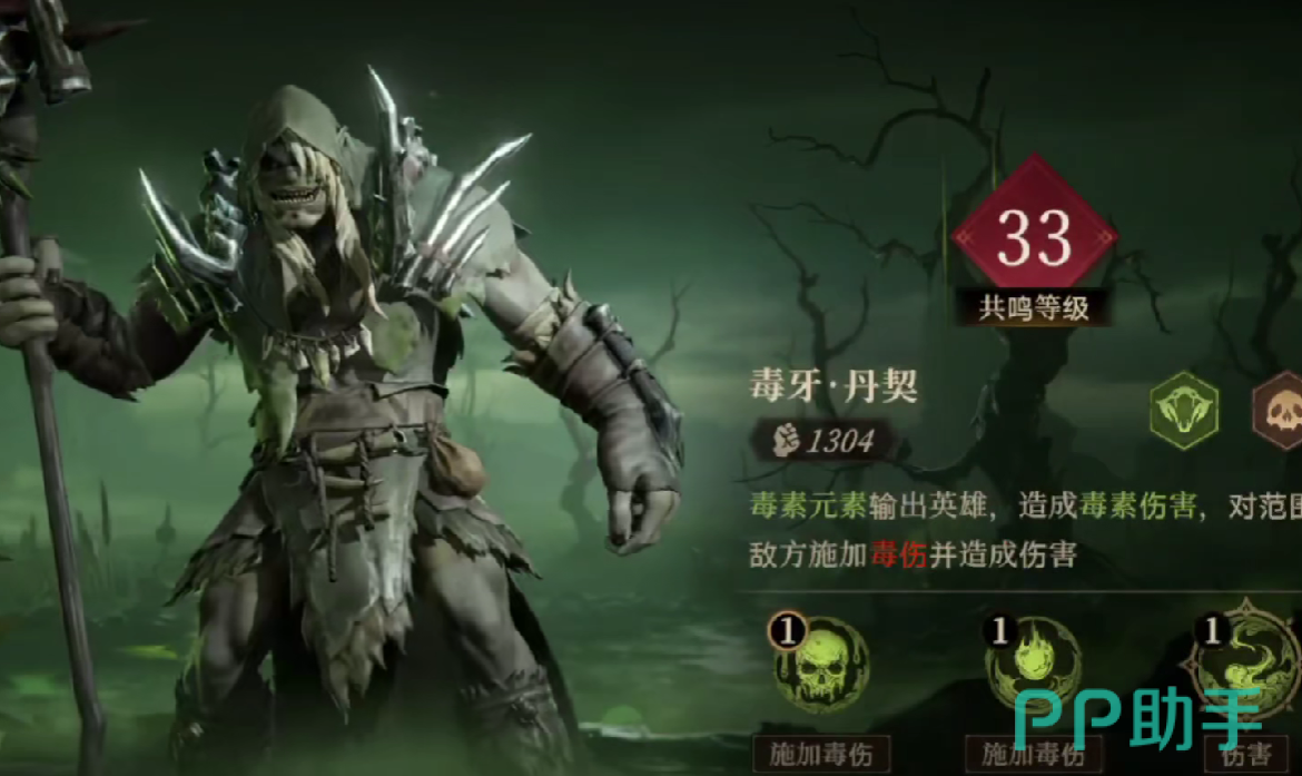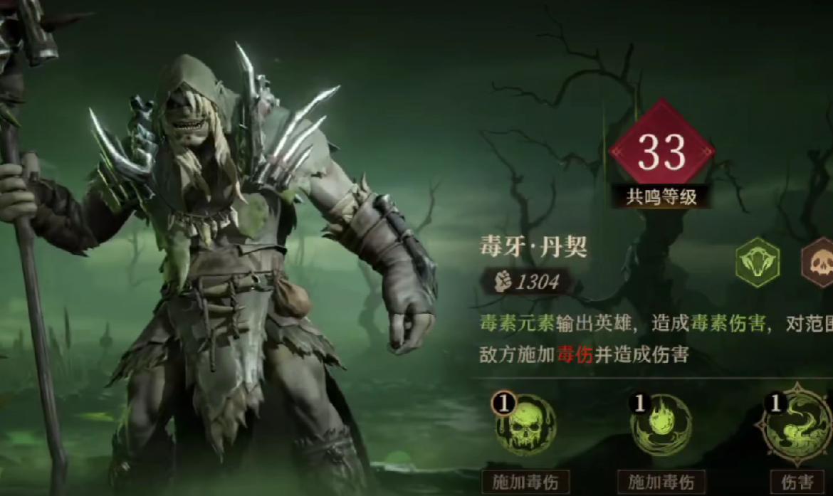 毒牙丹契在游戏内,是强大的毒属性输出角色,在团队当中,会充当主C,它能够造成毒属性范围性伤害,并且给敌人挂上毒属性dot。