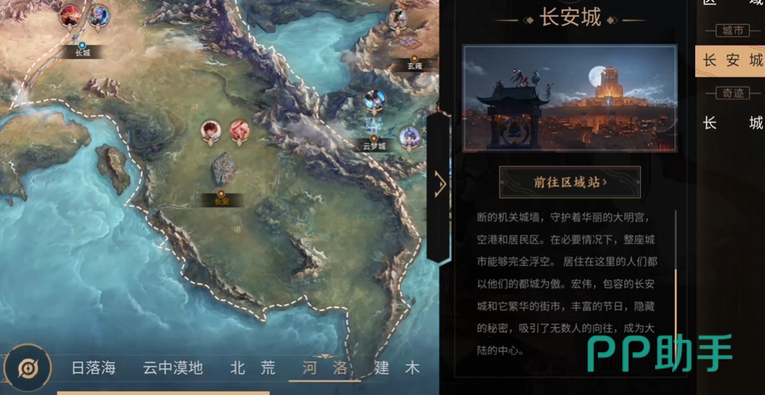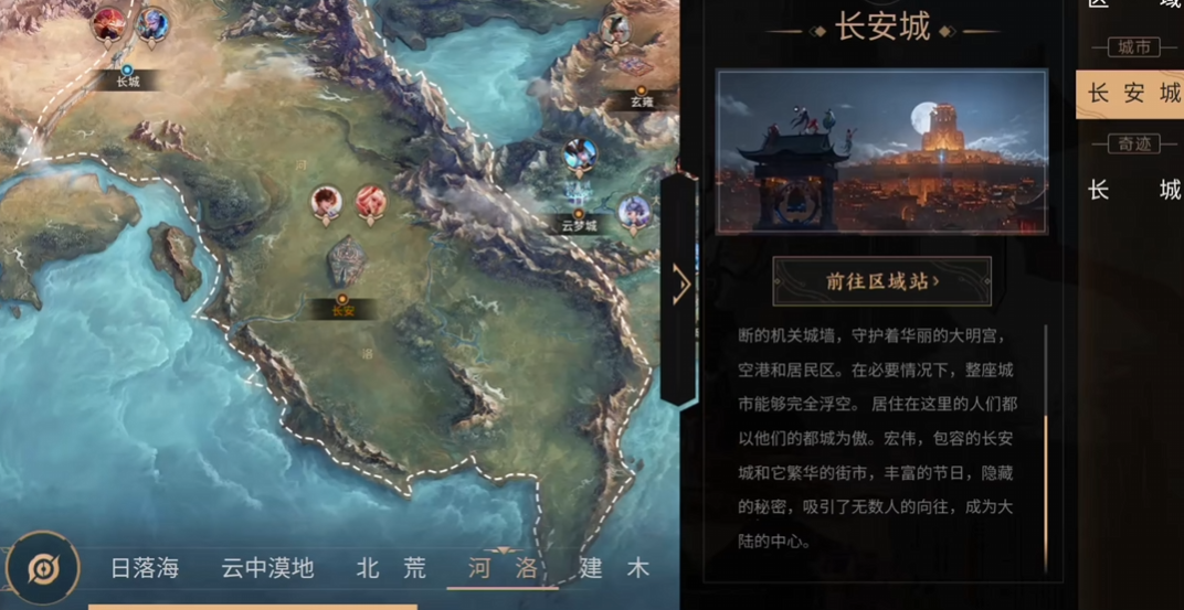 中部区域以长安为核心,即“洛河”所在——地处整张大陆版图正中心。该区域高度还原盛唐长安风貌,涵盖长安城、大明宫、长安坊市等标志性建筑群,兼具恢弘宫殿与烟火市井。武则天、李白、狄仁杰等英雄角色均以此地为叙事原点,承载深厚历史文化语境。