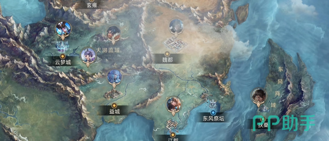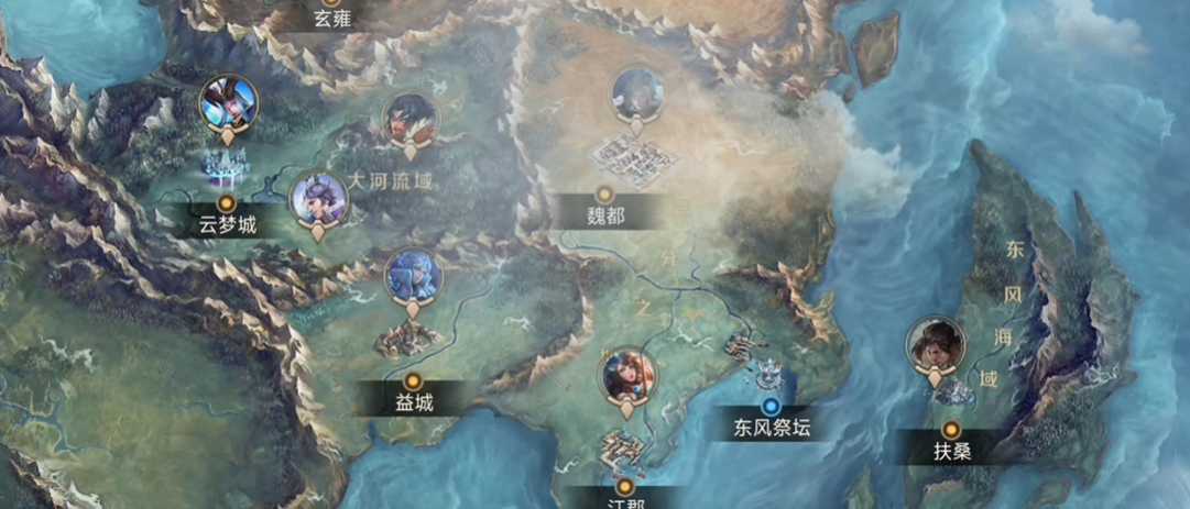 东部地区包含三大子区域:其一为“三分之地”,地处大陆东南,是新手起始区域,融合三国历史元素,涵盖水乡、关隘与古战场,代表性地标有赤壁、长坂坡及魏蜀吴三座主城;其二为“东风海域”,由群岛构成,分布潮汐峡谷、深海秘境等动态水域场景;其三为“建木”,位于东风海域北部,属浮空神域,整体呈现上古神话美学风格。