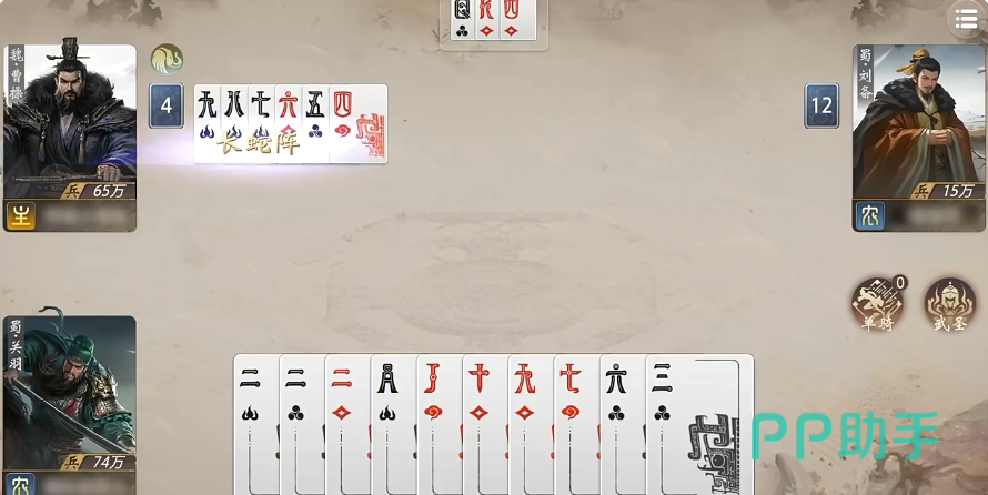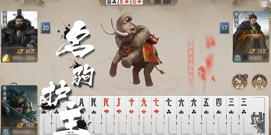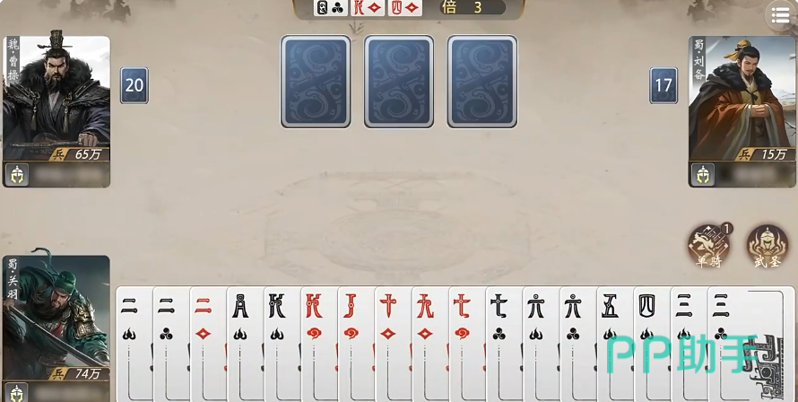 游戏的基本模式类似于三人竞速出牌,其中一名玩家担任特殊身份,最多可持有三张手牌,其余两人则组成另一阵营进行对抗。胜负判定标准为哪一方率先清空所有手牌即可获胜。虽然看似规则简单,但加入了武将技能和功能卡牌系统后,整体策略深度大幅提升。