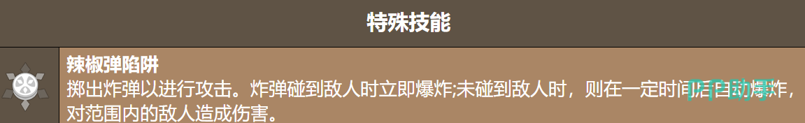 主动技能“辣椒炸弹”兼具功能性与资源管理价值。投掷后若直接命中目标,则立刻爆炸造成高额AOE伤害;若未命中,则落地延迟约1.2秒后自主引爆。该技能是除大招外最主要的火花获取手段,推荐在走位间隙高频使用,既可干扰敌方阵型,又能稳定维持火花层数。配合位移技能“突进”,可在被近身时快速脱离威胁距离,保障远程输出环境安全。