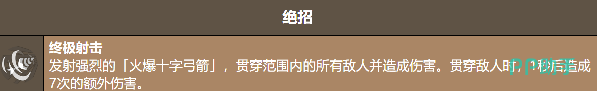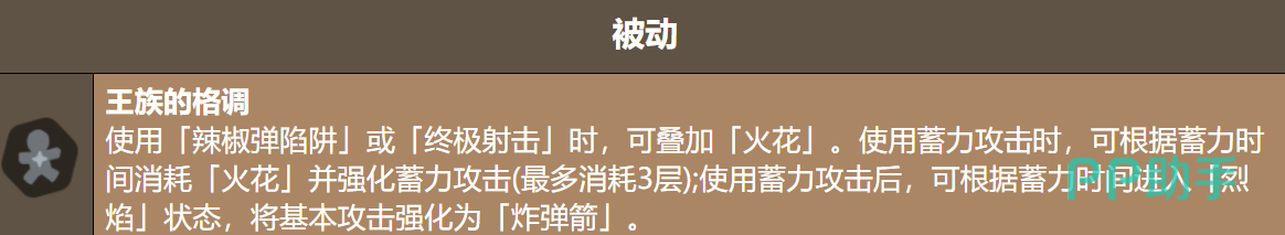 角色战斗体系围绕“火花”状态构建。每次释放辣椒弹或开启终极技能均可叠加1层火花,最高可累积至5层。当主动消耗全部火花时,将触发“烈焰附体”效果——持续期间,基础攻击由普通箭矢转变为具有范围溅射与更高单体伤害的炸弹箭。该状态是打出成吨伤害的关键前置条件,不可忽视其触发逻辑。