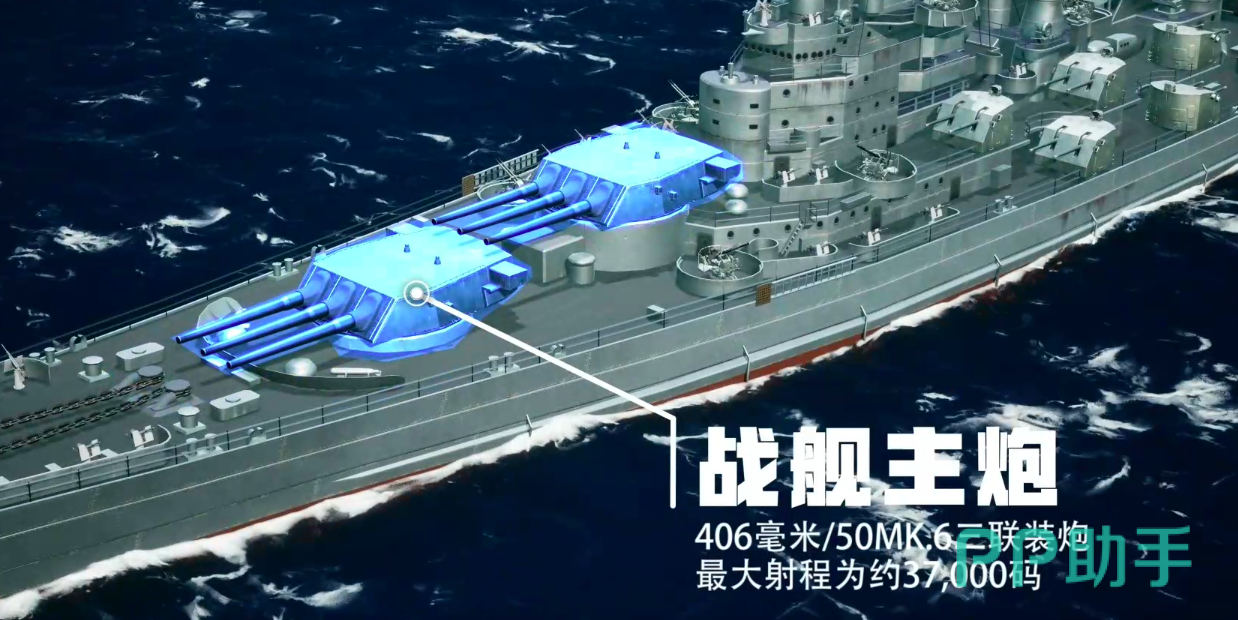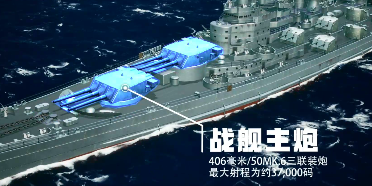 火力配置方面,主炮采用3座三联装406毫米/50倍径MK.6舰炮,最大有效射程达37000码(约33830米),具备远距离压制与穿甲打击能力;副炮系统由10座双联装127毫米/38倍径MK.12高平两用炮构成,兼顾对海与中低空目标拦截;防空体系则由15座四联装博福斯40毫米高射炮与36门单装厄利孔20毫米机关炮组成,形成近程密集弹幕,专精应对俯冲轰炸机等高速突防单位;核心防护上,主装甲带最厚处达305毫米,可有效抵御同级战列舰主炮的常规射击角度命中。