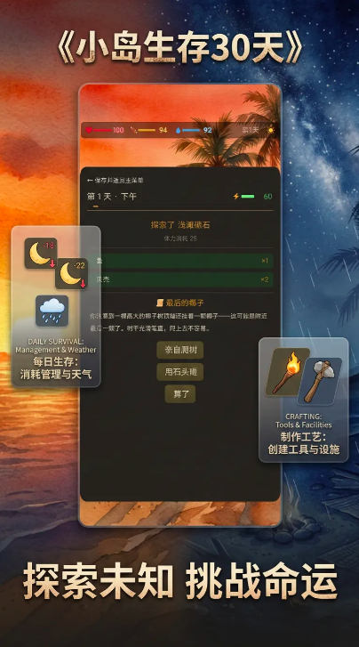 一场突发空难后,你成为荒岛上唯一的生还者。外界救援预计30天后抵达——这30天,是你与自然博弈、与时间赛跑的关键周期。能否活下来,取决于你对环境的理解、对资源的判断,以及每一次关键抉择。