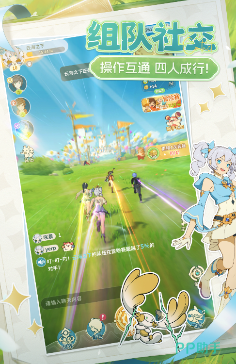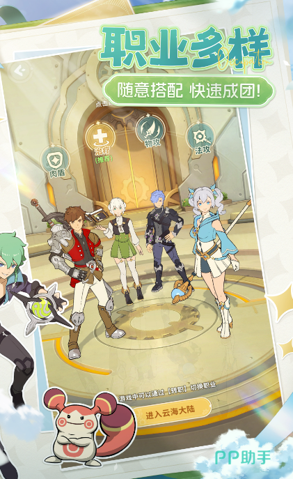 游戏的整体化风向是一部精美治愈的日式动漫,能够让小伙伴们感到相当的放松。故事发生在一片名叫云海大陆的世界,小伙伴们在进入游戏之后共有8个职业可以选择,定位有坦克、输出、辅助等,小伙伴们可以根据自己平时玩游戏的喜好来确认选择的职业,每个职业都非常的富有特色。将特定的职业进行组合搭配之后还将会触发一些额外的效果,比如说增加血量或者增加攻击力等。