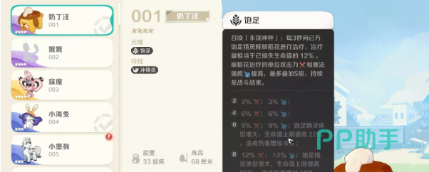 当奶丁汪召唤出丰饶神种后,每三秒即可为己方全体精灵施加一次稻花治疗效果,回复量基于目标当前已损失生命值的12%。这意味着血量越低的单位恢复越多,急救能力极强。此外,受治疗的精灵还能获得魔法强度和攻击力的增益,最多叠加5层,且增益状态可持续至战斗结束,真正实现越战越勇。