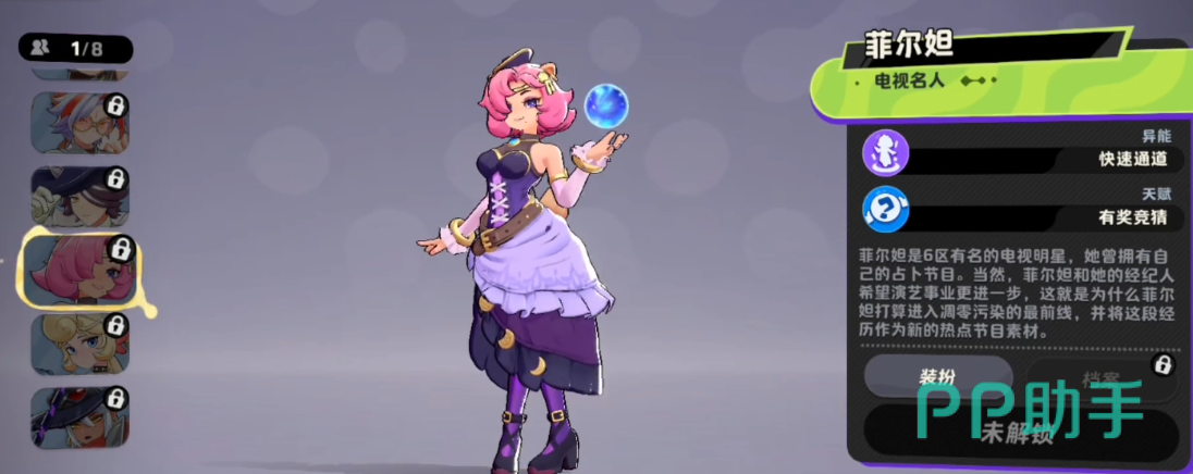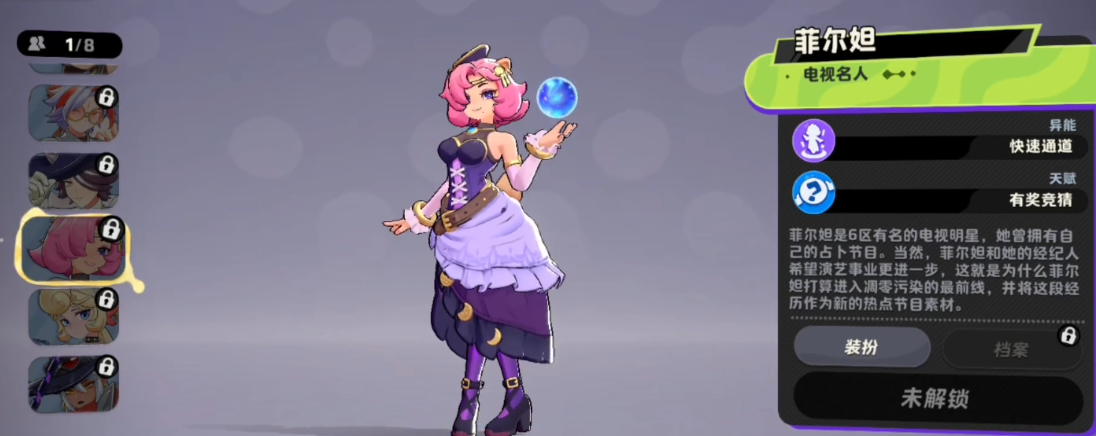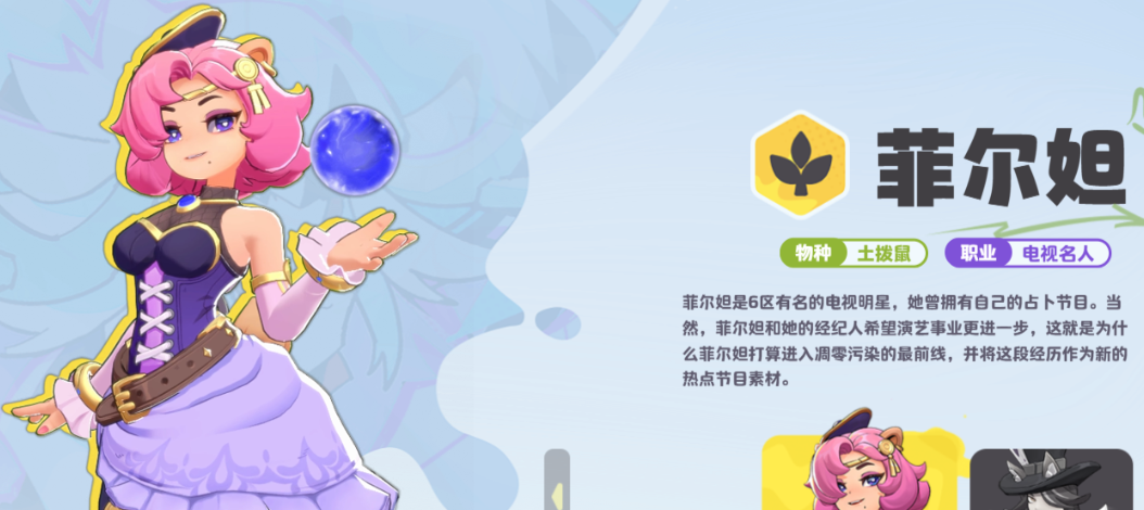 根据官方角色档案记载,菲儿坦的职业身份为一线新闻调查记者,其外观设计灵感源自土拨鼠生物特征:体型娇小、动作敏捷,并融入占卜师元素,在立绘与模型中稳定呈现水晶球道具。该设定不仅强化角色辨识度,也与其异能逻辑形成叙事闭环。