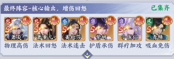 【全能均衡流】美杜莎+小医仙+紫妍+萧薰儿+青鳞+萧炎 作为综合强度最高的终极阵容之一,其设计逻辑融合真伤爆发、怒气循环、群体续航与生存保障四大维度。萧炎在真伤增益加持下打出稳定高额物理输出;萧薰儿维持全队怒气供给节奏;小医仙提供群体治疗与攻击加成;紫妍与青鳞分别强化能量回复与吸血续航;美杜莎延续法术连击优势,补充AOE压制能力。六人协同形成闭环生态,无明显短板,适用于所有高难度内容,是冲击服务器排行榜与参与跨服赛事的优选配置。