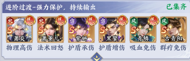 【护盾永续流】紫妍+黑擎+青鳞+萧薰儿+萧炎+古青阳 该阵容以“护盾—回怒—续航”三位一体为底层逻辑。萧炎作为物理高伤核心,在多重护盾覆盖下保持安全输出环境;萧薰儿专注法术回怒,高频供给全队怒气资源,确保关键技能无缝释放;古青阳提供群体治疗与免伤效果,显著延长队伍持续作战时间;紫妍、黑擎与青鳞分别承担能量补充、抗压承伤与吸血反哺功能。整套体系攻防均衡,在面对高爆发敌人或长线消耗战时展现出极强稳定性,是后期副本攻坚与跨服战的关键选择。