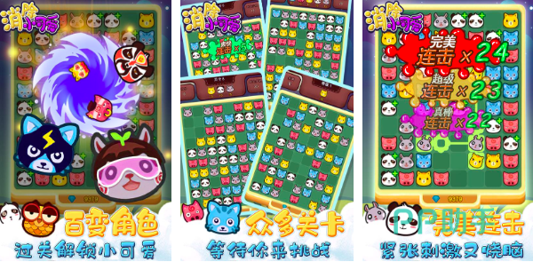 消除小可爱,让很多喜欢萌萌风格的玩家们心动不已。这款作品不仅文法简单,而且沿袭了传统消除游戏的基本原则,即使初次体验,也可以在2分钟的引导指南当中快速掌握,各种可爱的小动物元素和辅助道具,让很多玩家们爱不释手,5分钟就可以来上一局,上千个关卡等待玩家挑战。