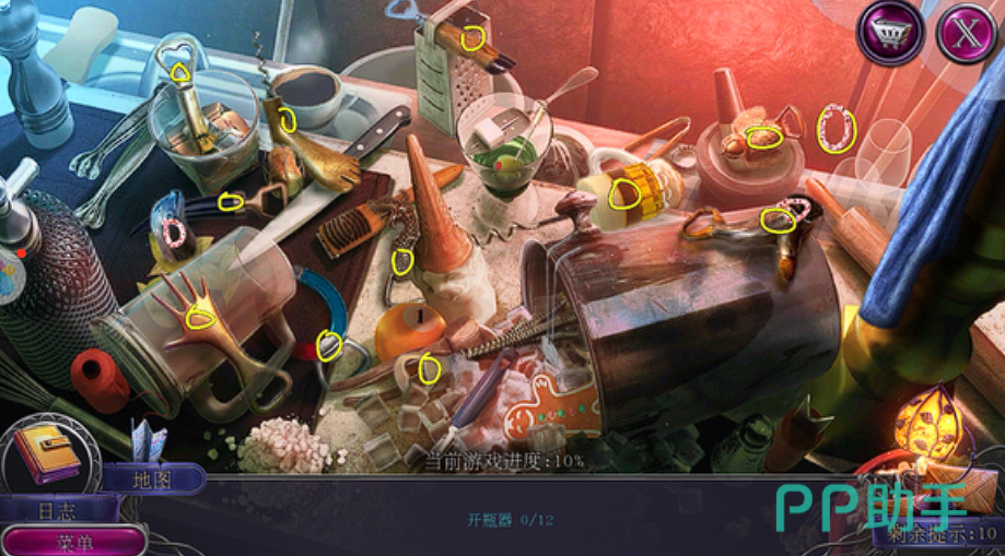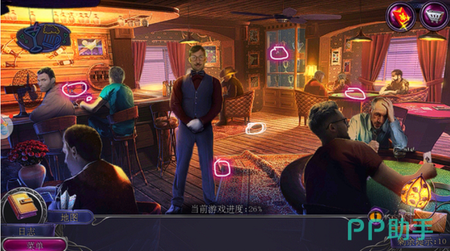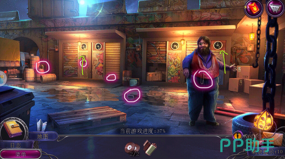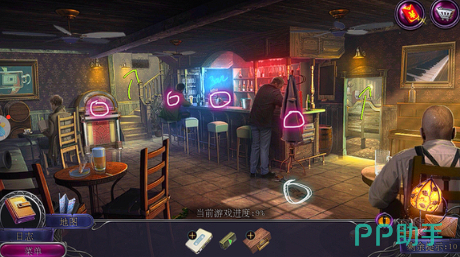 第四章:赌场的秘密在赌场章节,玩家首先需要在右边的灯箱下方找到扳钳。使用扳钳,可以在左边的售货机中获取电线缆线。接着,玩家需要将电线缆线在灯箱下方和汽车用电池缆线连接器连接起来,这样就能移动灯箱并完成寻物游戏,获得甜甜圈券。使用甜甜圈券在售货机旁可以换得甜甜圈,将甜甜圈给画者后,可以获得通行证和披萨刀。利用披萨刀能够与物品互动给到通行证,然后就能进入赌场内部。