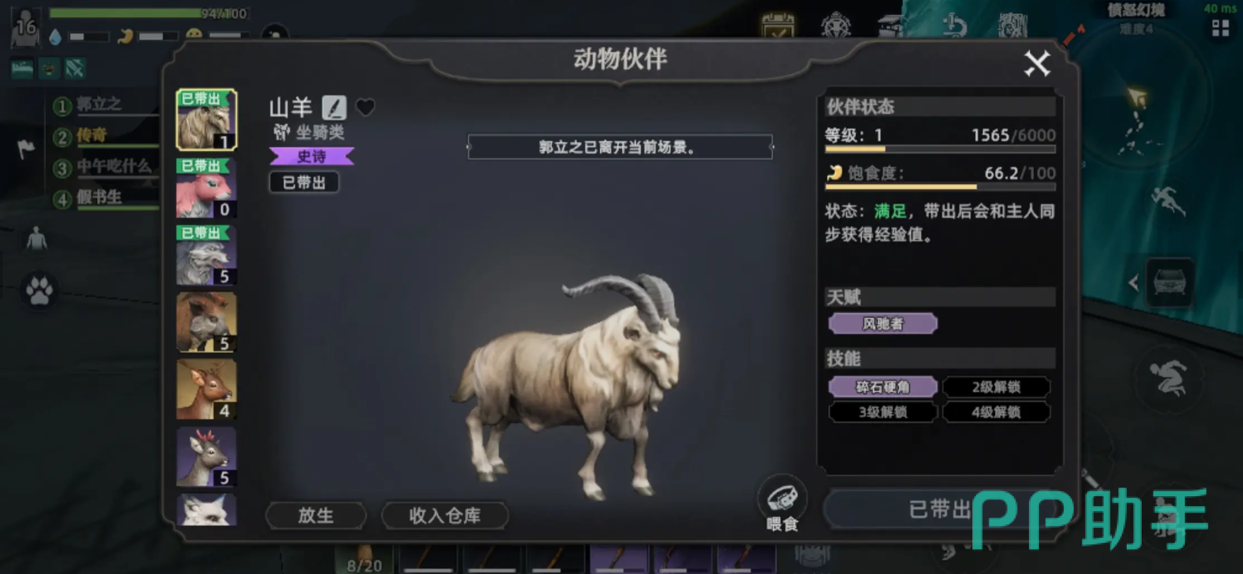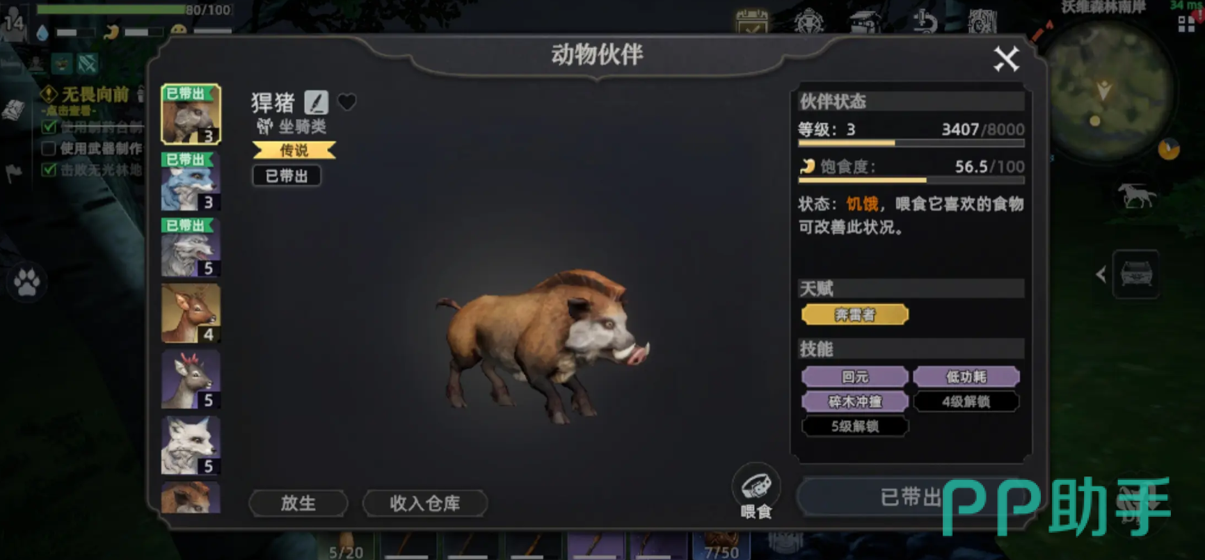 黑猪作为一种多功能宠物,拥有“碎木冲撞”技能,可用于高效采集木材资源。当其完成进化后,不仅采集效率提升,还能在战斗中发挥一定输出作用,成为兼顾生产与战斗的实用选择。山羊同样表现优异,擅长突破矿洞障碍,并协助开采地下矿物,是资源党不可或缺的帮手。
