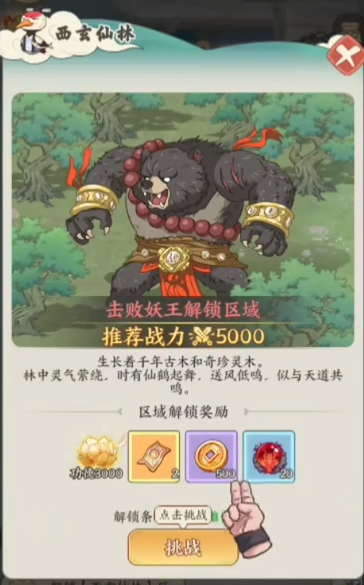 首个解锁区域为“西玄仙林”,但该区域被妖王盘踞,需先完成讨伐方可通行。作为新手首场战斗,难度设计友好,战力达到5000即可稳定通关。妖王拥有较高血量,建议合理配置技能释放节奏,避免无效输出。击败后除获得基础资源奖励外,正式开放西玄仙林——该区域盛产灵木,而灵木正是制作手串的核心材料,因此采集效率直接影响商业链运转速度。
